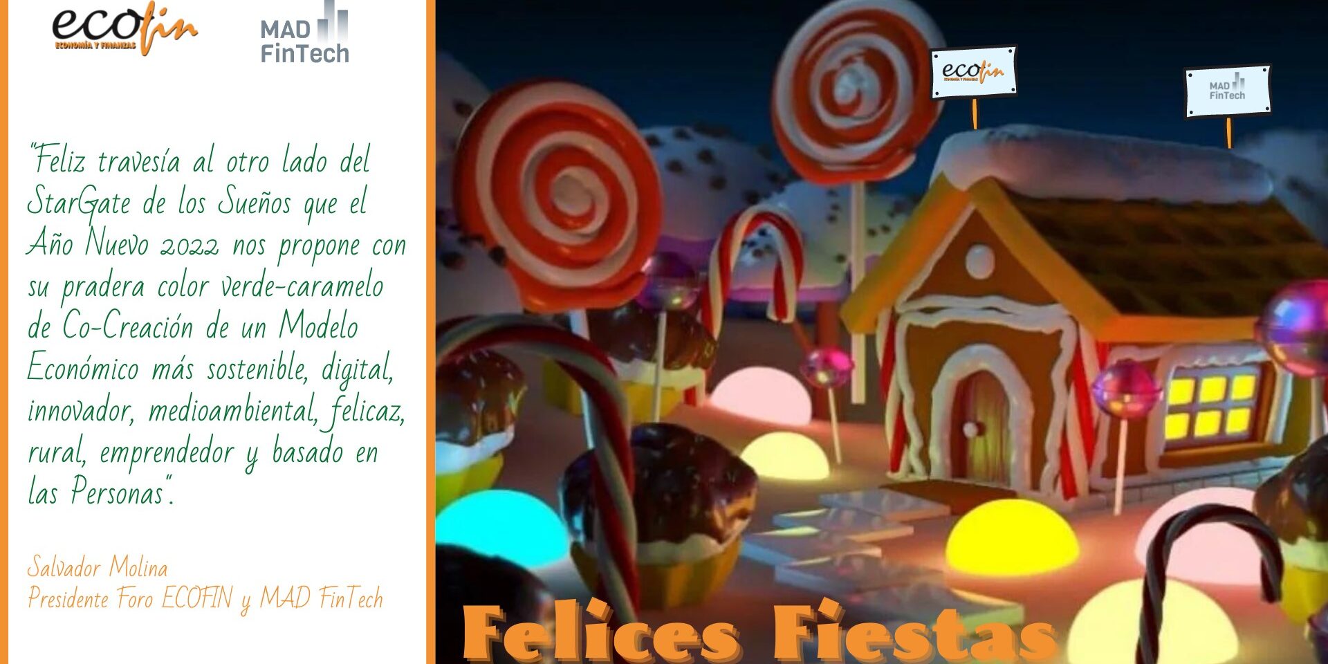 Queremos que todos los que seguís cada semana las actividades de Foro ECOFIN y MAD FinTech, los socios que lleváis más de 15 años apostando por nuestro trabajo, los directivos, empresas, instituciones y autoridades que nos acompañáis en cada InnoDay, La Noche de las Finanzas, Congreso ECOFIN, Observatorios, Talleres y Webinars; nuestras amigas, compañeras, socias y aliadas de Fundación Woman’s Week; nuestros medios amigos Intereconomía, Capital Radio, MásQueUnaRadio, Libertad FM, ClickRadioTV, Telemadrid, Televisión Española, OKdiario, Expansión, SegurosNews, ElAsesorFinanciero; nuestros socios del Colegio de Mediadores de Seguros de Madrid y del Colegio de Economistas de Madrid; las TopTenFinTech; el Ayuntamiento de Madrid y Comunidad de Madrid; Madrid Futuro, Madrid Nuevo Norte, Renazca, MIA (Madrid Investment Attraction), el Club Financiero Génova… y tantos cientos de empresas que nos seguís: queremos que todos y cada uno de vosotros tengáis el mejor año 2022 posible.