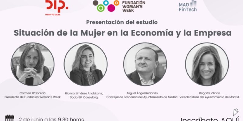 El clúster Madrid Capital FinTech, en colaboración con Bip Consulting y la Fundación Madrid Woman’s Week, va a presentar el estudio ‘Situación de la Mujer en la Economía y la Empresa, el próximo 2 de junio a las 9,30 horas.